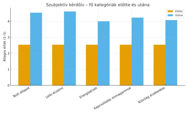 A mérésekhez MeriDiGráf meridiánmérőt, AVS Aura Video Station auramérőt és szubjektív kérdőívet alkalmaztunk. A mérések eredményei kimutatták az energiaszint növekedését, a jin–jang egyensúly javulását, valamint az aura és a csakrák harmonizálódását. A résztvevők fokozott energiaérzetet, érzelmi stabilitást és belső nyugalmat tapasztaltak.